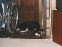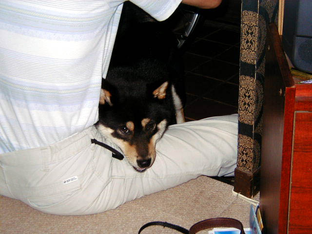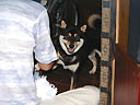 あっじ〜っ。 (玄関先のタイルでへばったのは初めてである。そうとうこの暑さがこたえるらしい)もう一歩たりとも動けないのである。 いつものように嫌がるボクを引き連れてお父さんは競馬場の片隅にたどり着いた。朝7時からすでに気温30度を軽く上回る。いつもどおりワンツーを済ませるが、もう足は上がらない。暑すぎるのである。 そんなわけでボクは毎日お父さんの自転車のカゴに乗せられて帰ってくる始末。トンズラマンも秋までおあずけとなろう。 ネエネの接近 そしてボクのお返し ほっかむりをさせたいらしい。ボクはひたすら逃げ回る。まだネエネはボクにほっかむりを成功させたことがない。 お返しといっては何だが、ボクは以前からネエネにしている毎日の習慣がある。ネエネが朝寝坊しているとき、必ずおきろ攻撃をベロベロとしてあげることだ。まあ、朝一のワンツーに出かける時のご挨拶と思ってくれればそれでいい。 今日は転がっていた手ぬぐいらしきものを引きずっていった。昨日ネエネがほっかむりをさせようと頑張っていた布だ。無論ネエネは夢ごごち。何が起きたがわからないでいる。ボクはネエネの顔を思い切りその手ぬぐいでぬぐってあげたのだ。へっへ〜。実はその長い布はお父さんが夜にボクの足を拭いていた足ぬぐい?だったのだ。 うっ、臭い。ネエネはある日ボクのカエルちゃんが枕元に転がっているのに気が付いて起きてきた。カエルちゃんはボクの超お気に入り。ボクの足の匂いがたっぷりと染み込んでいるのである。そんなに臭いかな〜?