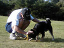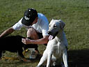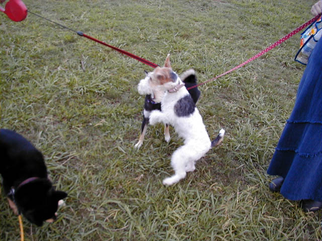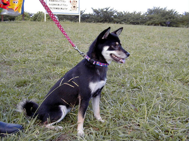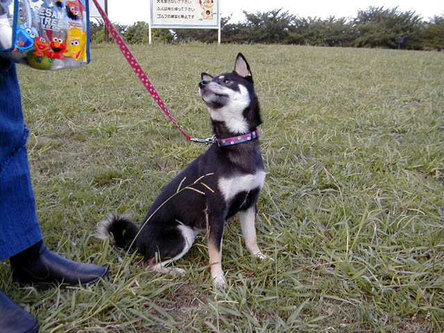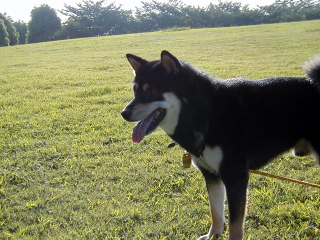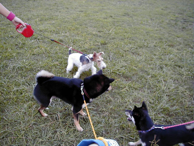 早かったな〜。一方ブラッキーは勝負犬のためネエネのお許しがでず、おとなしく匂いかぎに徹していた。しばらくするとびちょっとした体でユキちゃんは戻ってきた。モモちゃんは池に飛び込む寸前でママにつかまったらしい。いいなオレもやってみたい。まだ水遊びしたことがないのである。 |
