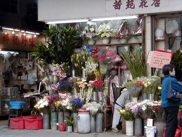 | 最近ではこういう路上に面したところの花屋はめずらしくなってきました。ふと見るととなりが鳥屋さんというところがなんともローカルですね。香港でも不況が続き、ビルの2Fなどでひっそりと営業するところが増えているらしいです。一流ホテルですらクローズしたところは少なくはありません。 |