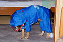 ネエネがとりあえずといって背中にタックを取りテープでとめてくれた。だがズボンの部分(後ろ足)がブカブカで心配であった。案の定途中で片方の足が抜けてしまった。お父さんに履かせてもらったが、ガサガサが気になって思うようにワン・ツーができなかったのである。ああ、僕はレインコートなしでもいい。ずぶぬれになってもいい。強い柴犬なのだ。
