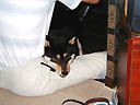 あっじ〜っ。 (玄関先のタイルでへばったのは初めてである。そうとうこの暑さがこたえるらしい)もう一歩たりとも動けないのである。 いつものように嫌がるボクを引き連れてお父さんは競馬場の片隅にたどり着いた。朝7時からすでに気温30度を軽く上回る。いつもどおりワンツーを済ませるが、もう足は上がらない。暑すぎるのである。 そんなわけでボクは毎日お父さんの自転車のカゴに乗せられて帰ってくる始末。トンズラマンも秋までおあずけとなろう。 ネエネの接近 そしてボクのお返し ほっかむりをさせたいらしい。ボクはひたすら逃げ回る。まだネエネはボクにほっかむりを成功させたことがない。 お返しといっては何だが、ボクは以前からネエネにしている毎日の習慣がある。ネエネが朝寝坊しているとき、必ずおきろ攻撃をベロベロとしてあげることだ。まあ、朝一のワンツーに出かける時のご挨拶と思ってくれればそれでいい。 今日は転がっていた手ぬぐいらしきものを引きずっていった。昨日ネエネがほっかむりをさせようと頑張っていた布だ。無論ネエネは夢ごごち。何が起きたがわからないでいる。ボクはネエネの顔を思い切りその手ぬぐいでぬぐってあげたのだ。へっへ〜。実はその長い布はお父さんが夜にボクの足を拭いていた足ぬぐい?だったのだ。 うっ、臭い。ネエネはある日ボクのカエルちゃんが枕元に転がっているのに気が付いて起きてきた。カエルちゃんはボクの超お気に入り。ボクの足の匂いがたっぷりと染み込んでいるのである。そんなに臭いかな〜?