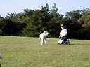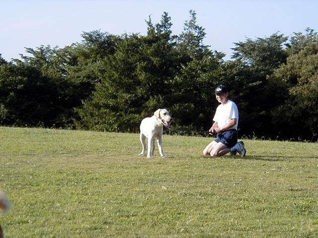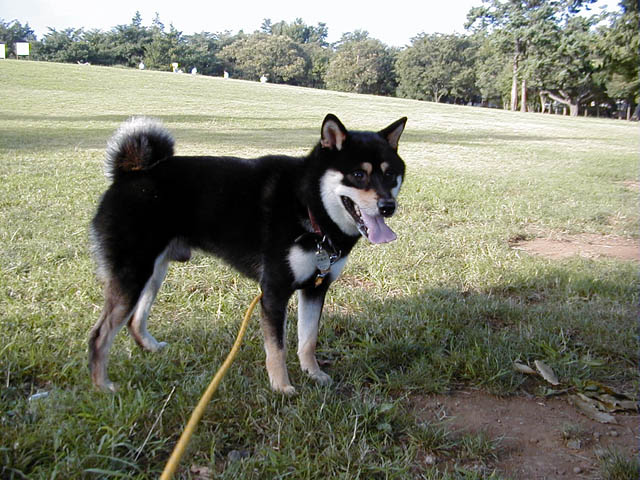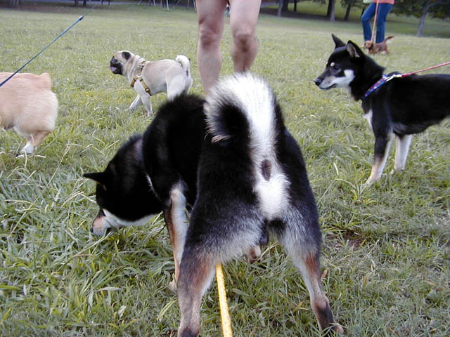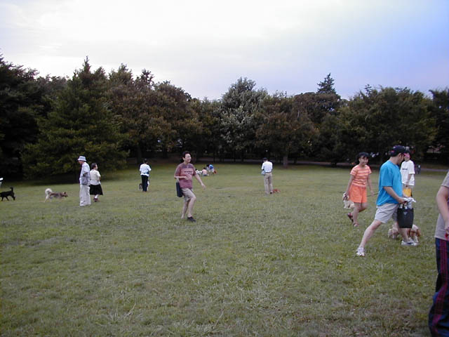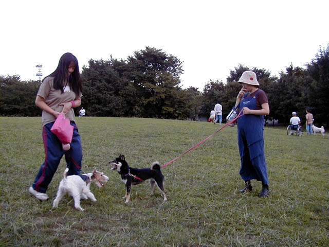 早かったな〜。一方ブラッキーは勝負犬のためネエネのお許しがでず、おとなしく匂いかぎに徹していた。しばらくするとびちょっとした体でユキちゃんは戻ってきた。モモちゃんは池に飛び込む寸前でママにつかまったらしい。いいなオレもやってみたい。まだ水遊びしたことがないのである。 |