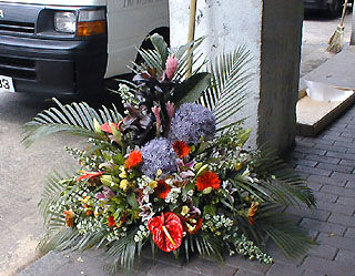| 香港でのフラワーアレンジメントは今でもブリテッシュスタイルの伝統を受け継いでいます。これだけ大きなお花は通常お店の開店祝いなどで軒先に並べられます。花も沢山入っていて見事です。 |