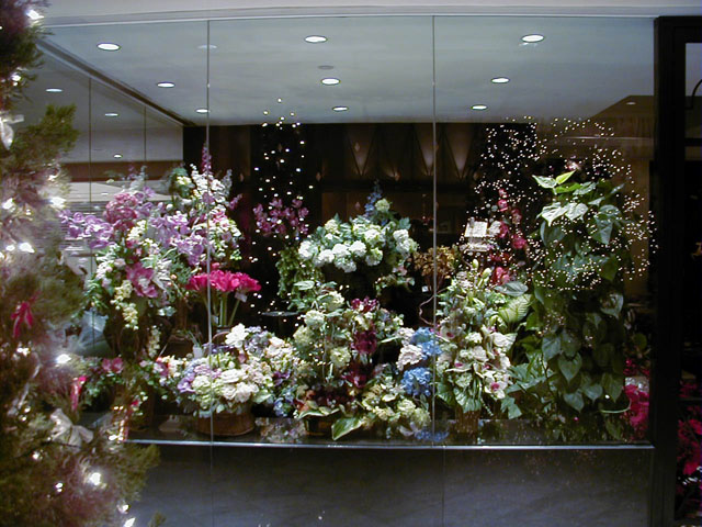 | 一流ホテルの花屋はこんな感じにアートフラワーで飾られています(相変わらずアートフラワーは人気)。フレッシュフラワーの品数はぐっとしぼりこんでいました。 |