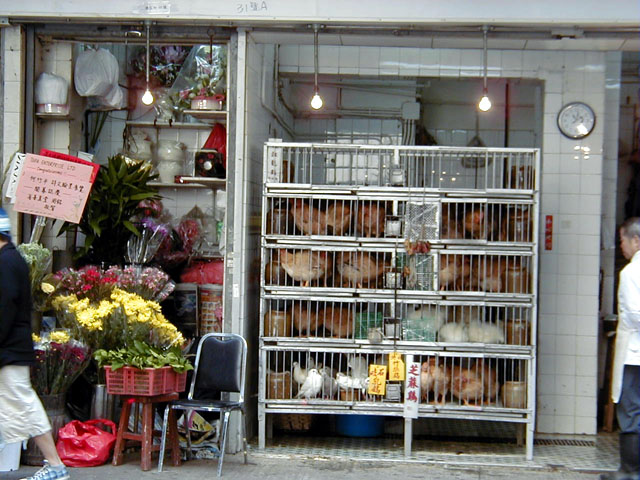 | 最近ではこういう路上に面したところの花屋はめずらしくなってきました。ふと見るととなりが鳥屋さんというところがなんともローカルですね。香港でも不況が続き、ビルの2Fなどでひっそりと営業するところが増えているらしいです。一流ホテルですらクローズしたところは少なくはありません。 |