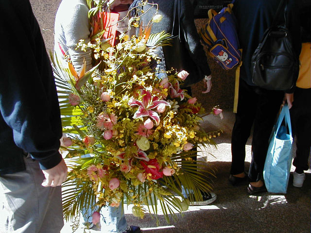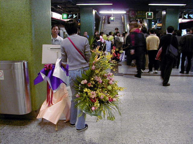 地下鉄で、配達のお姉さんの後をちょっとだけついてゆきました。実に10kgもあろうという花カゴを片手にゆっさゆっさと人ごみを避け階段を上って行ったのです。手伝ってあげたかったのですが。フローラも両手に荷物で....はははっ.....こちらも花屋と化してました! |