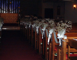 | このページに乗っている写真はすべて準備段階の写真です。 夜だったので暗いのですが勘弁ね。 メインブーケに戻る 可愛いヨーロピアンスタイルのブーケ 教会の様子 レセプション用の装飾花 |