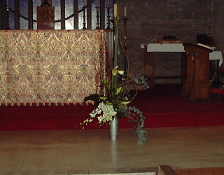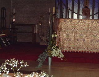 一番後方のキャンドルが立っているところへ置こうと思っていましたが、教会の関係者さんのアドバイスでフロントに出すことになりました。スタンドの用意がなかったため急遽床にじかに置くこととなりましたが、これも素敵でしたよ。 正面向かって左側 |