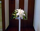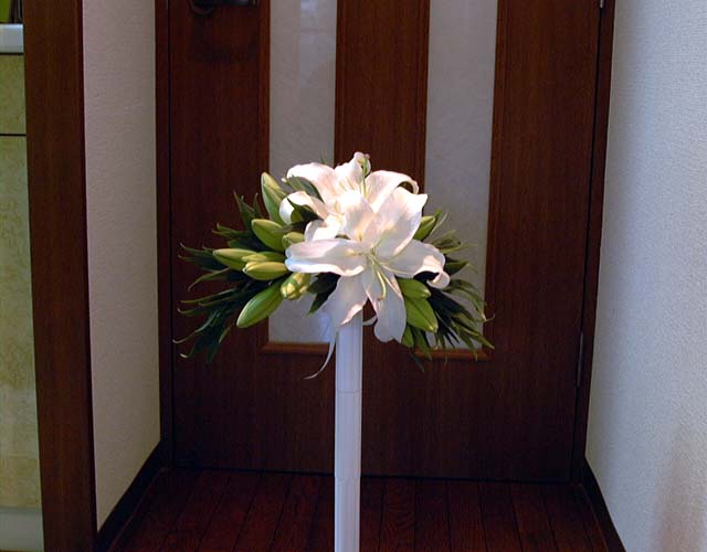 | 夏向きのすっきりとしたウエディング・ブーケが素敵。6月に入りウディングのニュースが沢山入ってきます。皆さんお幸せに。 アームブーケラフィアを使って束ねて行きます。パッキングまでがお勉強です。 |